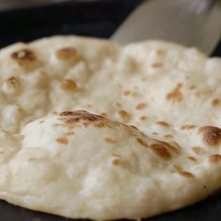 After resting, knead dough well and divide the dough into equal portions. Roll out the naan, make sure it is not too thin and or too thick. Heat a pan on medium heat. Apply little water all over the top side of the naan. We want the naan to stick to the pan while cooking so it does not fall off. Once you've applied water to one side, place the watered side on the pan (it should stick right away). Once you see some bubbles forming on top of the naan, flip the pan on top of the stove. (This is where you want the naan to stick on the pan and not fall off! ). You'll see some burnt marks on naan, remove it from stove flame. Once the naan is cooked well, remove from pan, apply some butter and serve hot!
